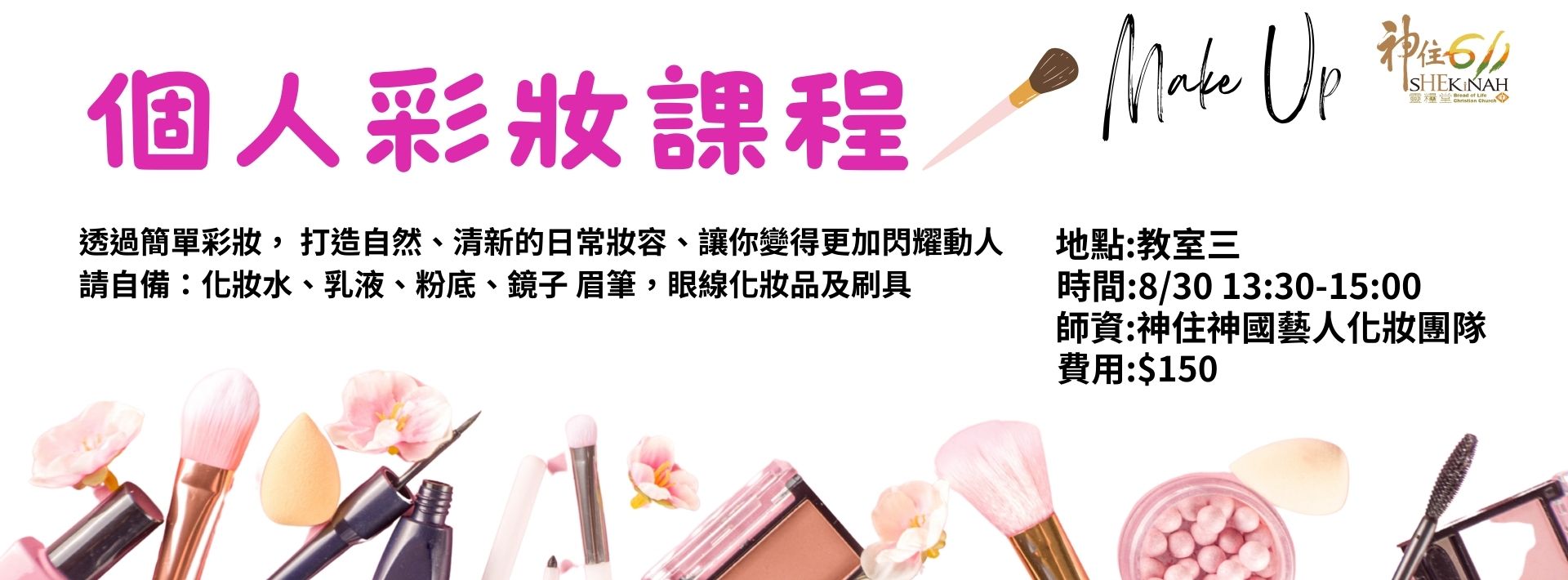 個人彩妝課程 24 8 月, 2025 裝備課程 個人彩妝課程時間:8/30 13:30-15:00地點:教室三費用:150師資:神住神國藝人化妝團隊透過簡單彩妝, 打造自然、清新的日常妝容、讓你變得更加閃耀動人請自備:化妝水、乳液、粉底、鏡子 眉筆,眼線化妝品及刷具。